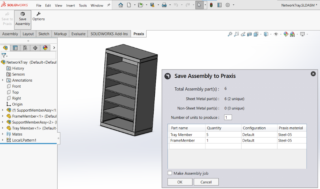 Open an assembly and use the Save Assembly toolbar command to save the assembly parts to the part library. The assembly save dialog displays the assembly BOM with part instance counts along with the identified raw-material. Press OK to save the parts to Praxis.