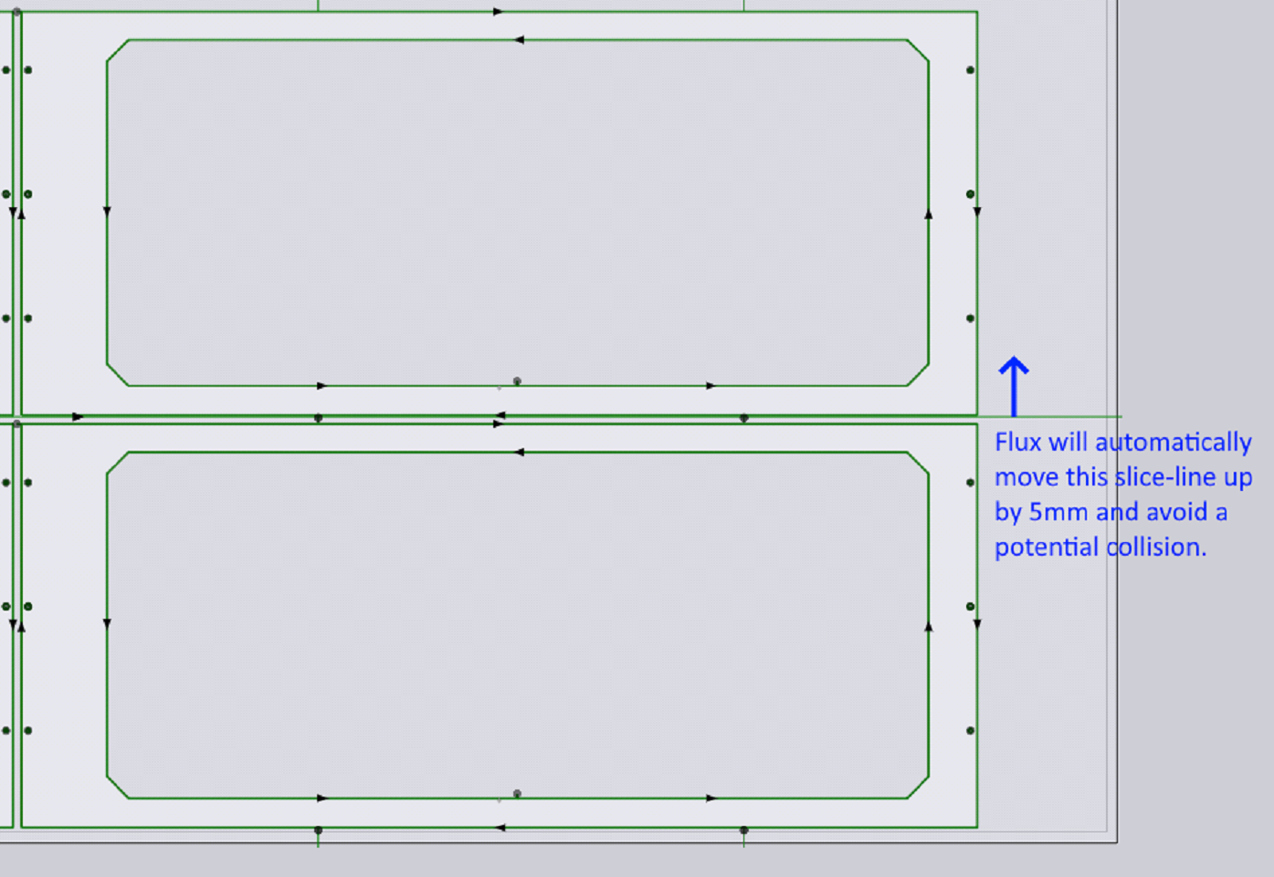 Lengthy slice cuts running parallel to a part outline are dangerous. TecZone identifies such situations and will try new slice line position, 5mm on either side to see if collision is avoided. This is done only when very long cuts (> 800mm) are found.