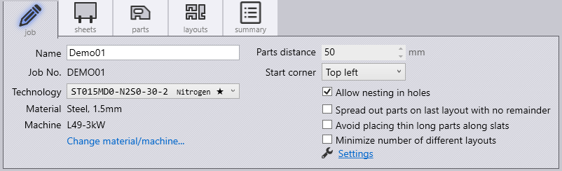 Click OK to see pages for Job, Sheets, Parts, Layouts and Summary settings.
